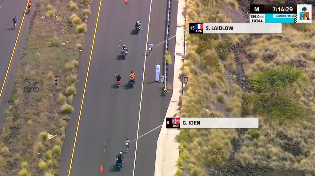 Iden finished the 112-mile bike course in 4:11:06 to stay within striking distance of Laidlow, who was second out of the water and took the race lead early in the bike. The Frenchman was not on most expertʻs list of race contenders, but went out blazingly fast and averaged 27.59 mph per mile to smash the previous Kona bike course record by five minutes. Cam Wurf had held the previous record of 4:09:06, set in 2018.