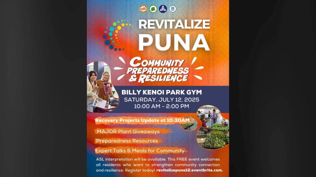 “Revitalize Puna is about partnership, empowerment and action,” said Kierkiewicz in the announcement. “We’re showing up where the community is — to talk about the real issues, share updates and make sure Puna’s recovery reflects the needs and voices of our people.”